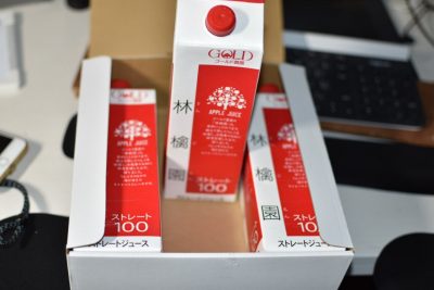 パッケージの説明によりますと、青森県津軽地方にあるゴールド農園では樹上で熟したリンゴを収穫し、冷蔵庫で鮮度管理しています。絞る時期や品種によって味は違ってくるようです。ビタミンC(酸化防止剤)以外の添加物は不使用。リンゴそのものの偽りなき味です。