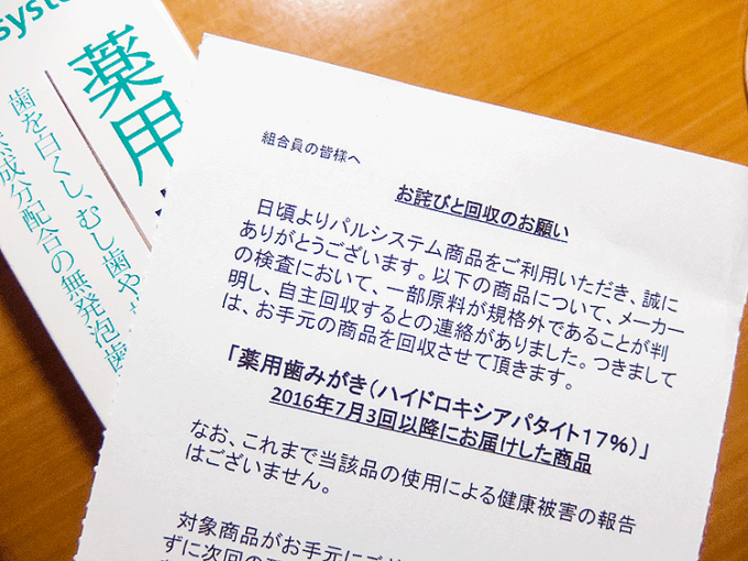 パルシステムさんから薬用歯みがき(ハイドロキシアパタイト17%)を、自主回収したいというハガキが届きました。「なにがどれくらい」含まれていたのかを調べてみました。 -