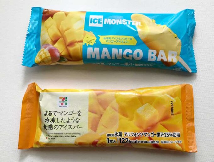 セブンイレブンの「まるでマンゴーを冷凍したような食感のアイスバー」、ローソンの「ICE MONSTER マンゴーバー」を食べくらべ。 -