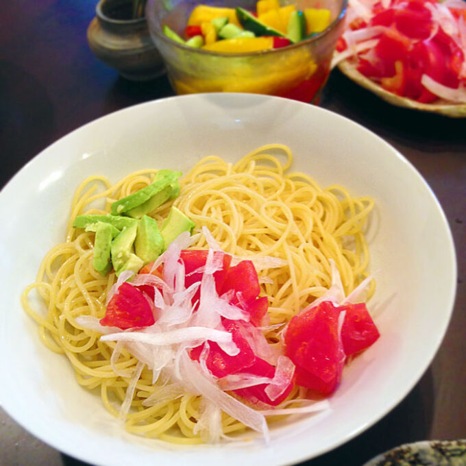 ネット界では、乾麺パスタを一時間以上水に浸してから茹でるのが、流行しているらしい。さっそく、道具を揃えて、乾麺パスタを水に数時間浸して準備をし、サラスパで食べてみた。 -